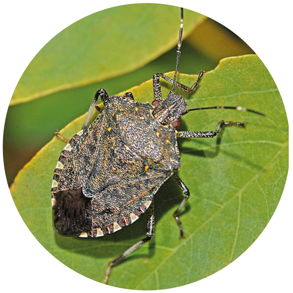 Halyomorpha halys. With their piercing mouthparts, they suck the juice from plants, causing discolouration on the surface of the fruit and deformities. Adults prefer to feed on fruit, while nymphs also feed on leaves and stems. The damage caused reduces crop yields, as the affected fruit cannot be sold, resulting in significant economic losses.